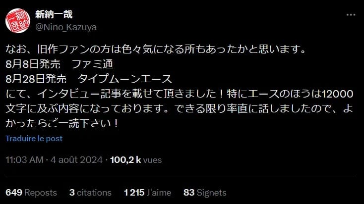Nino Kazuya announced on Twitter that the Weekly Famitsu Magazine issue releasing August 8 will feature a new interview with him. The Type-Moon Ace Magazine issue releasing on August 28 will have another, huge interview (over twelve thousand characters in Japanese). We should learn much more about the remake via these interviews.